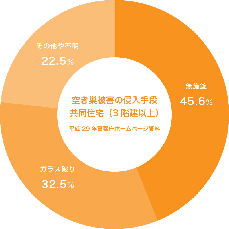 ビルなどが3階建未満の場合、空き巣の手段として施錠忘れとガラス破りが大半になります。侵入経路として多いのは1位が窓、2位が表出入り口です。