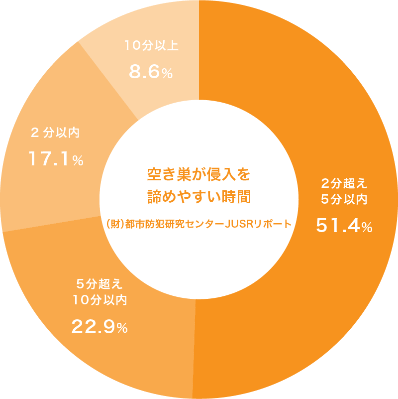 侵入に時間がかかればかかるほど、用 心深い侵入盗犯は犯行をあきらめます。 最も多いのが 2~5分。侵入に5分以上要すると あきらめる確率が高いのです。